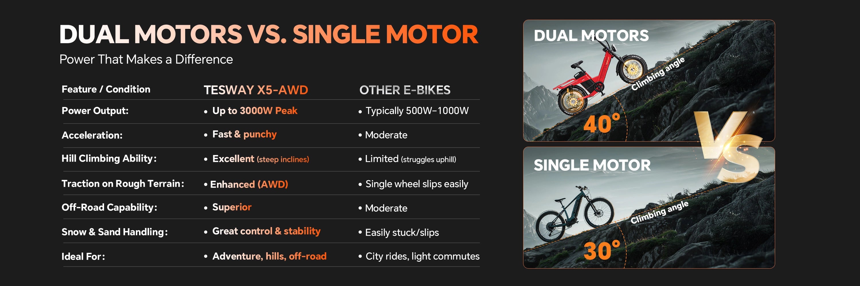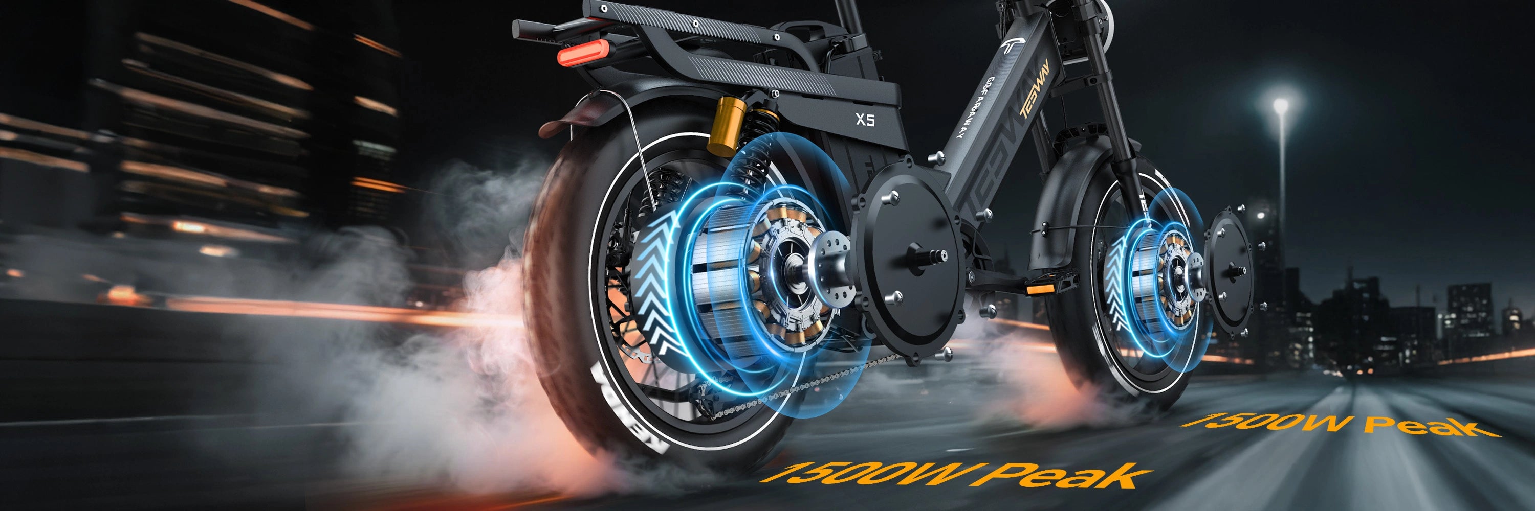 Ride farther and conquer any terrain with the TESWAY X5 AWD e-bike. Its industry-leading 320 KM range and dual-motor all-wheel drive deliver unstoppable performance on city streets or mountain trails.